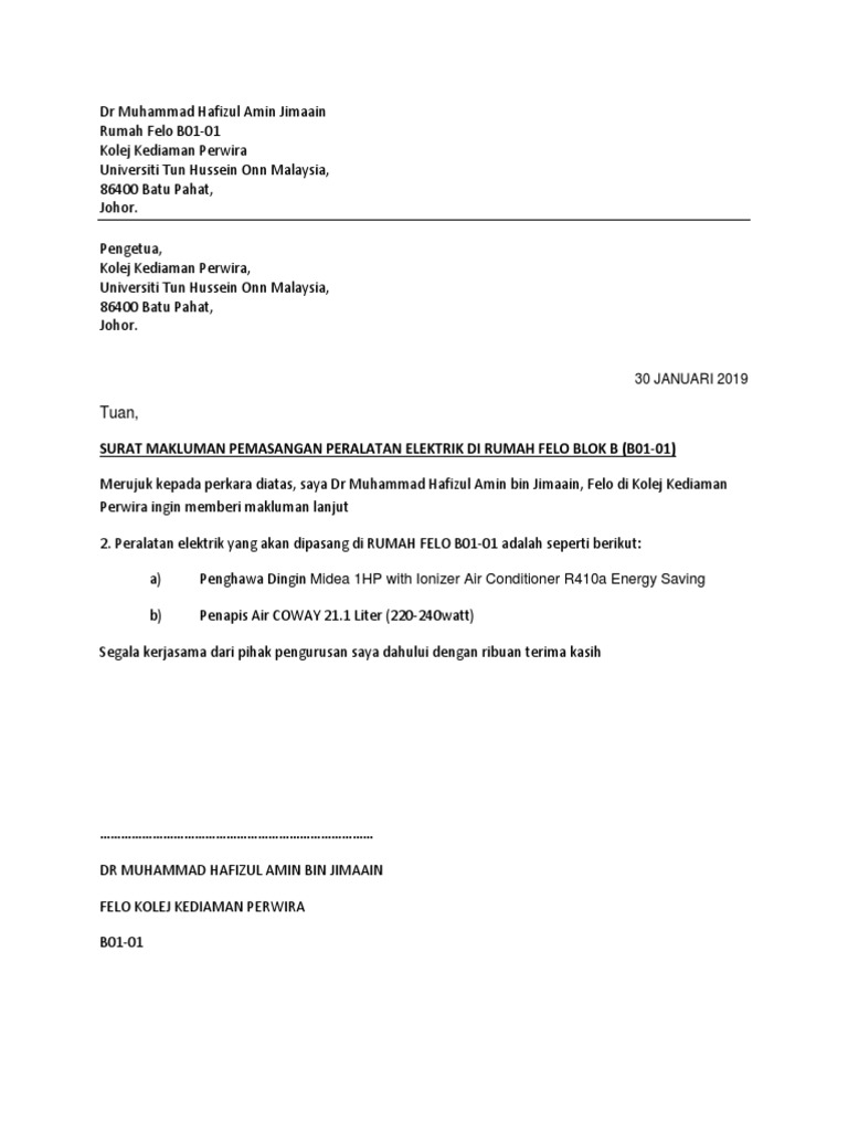 Surat Makluman Pemasangan Peralatan Elektrik Di Rumah Kuarters Pdf